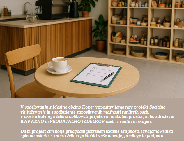 V sodelovanju z Mestno občino Koper vzpostavljamo nov projekt Socialno vključevanje in spodbujanje zaposlitvenih možnosti ranljivih oseb, v okviru katerega želimo oblikovati prijeten in unikaten prostor, ki bo združeval KAVARNO in PRODAJALNO IZDELKOV oseb iz ranljivih skupin. Da bi projekt…
